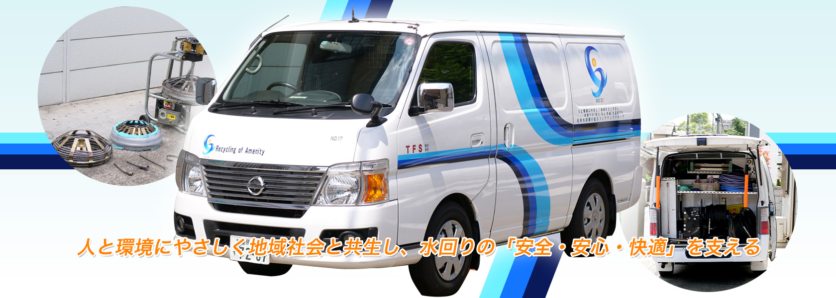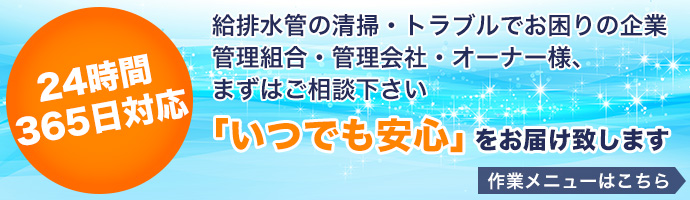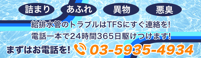 給排水管の詰まり、あふれ、悪臭等、配管にまつわるトラブルでお困りの方、24時間365日対応のTFS株式会社にお任せ下さい。若さとフットワークを活かして迅速に対応致します。